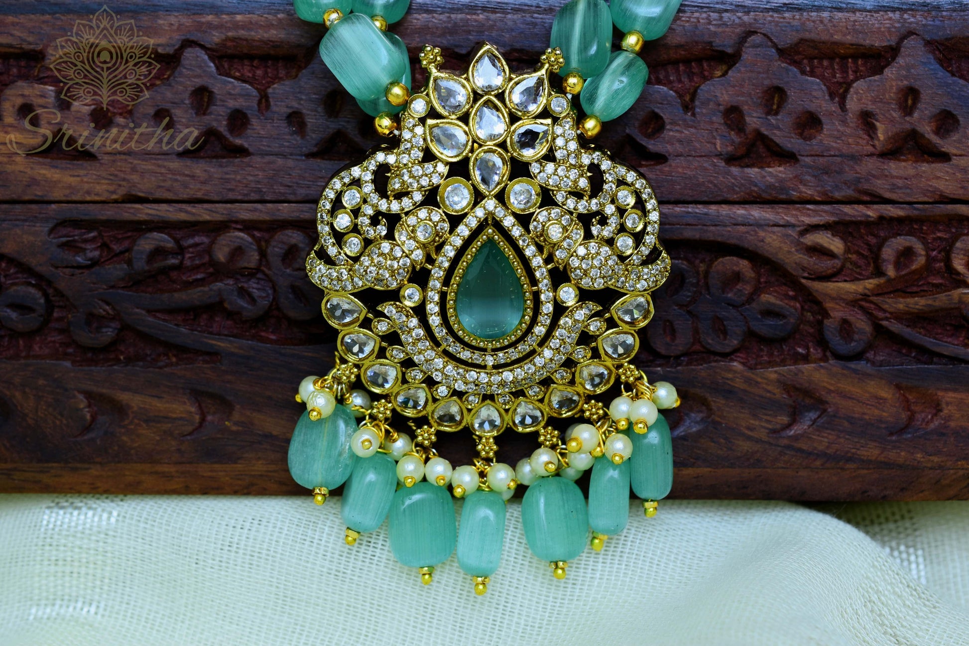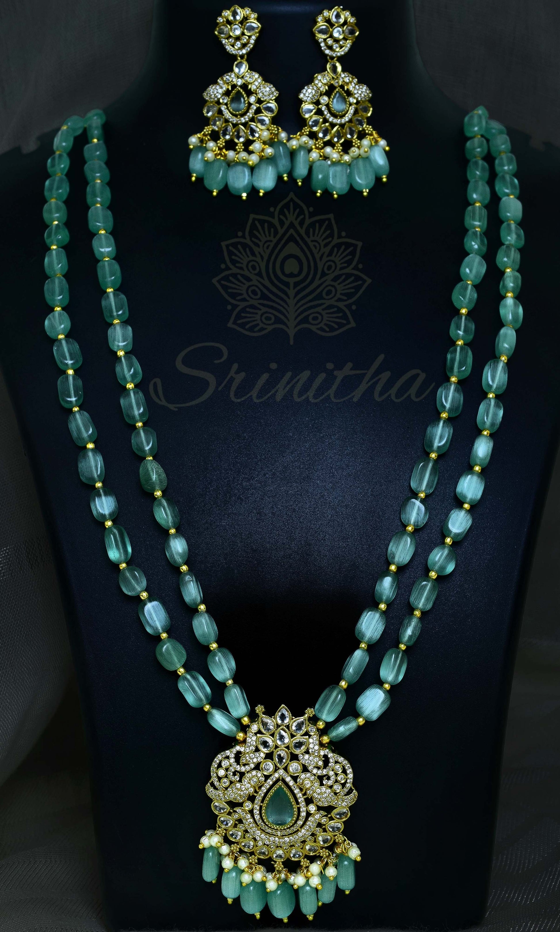 A delicate dual‐strand necklace featuring mint‐frosted beads with golden accents, paired with an attached detailed kundan pendant and matching earrings — graceful, versatile, and imbued with refreshing elegance.