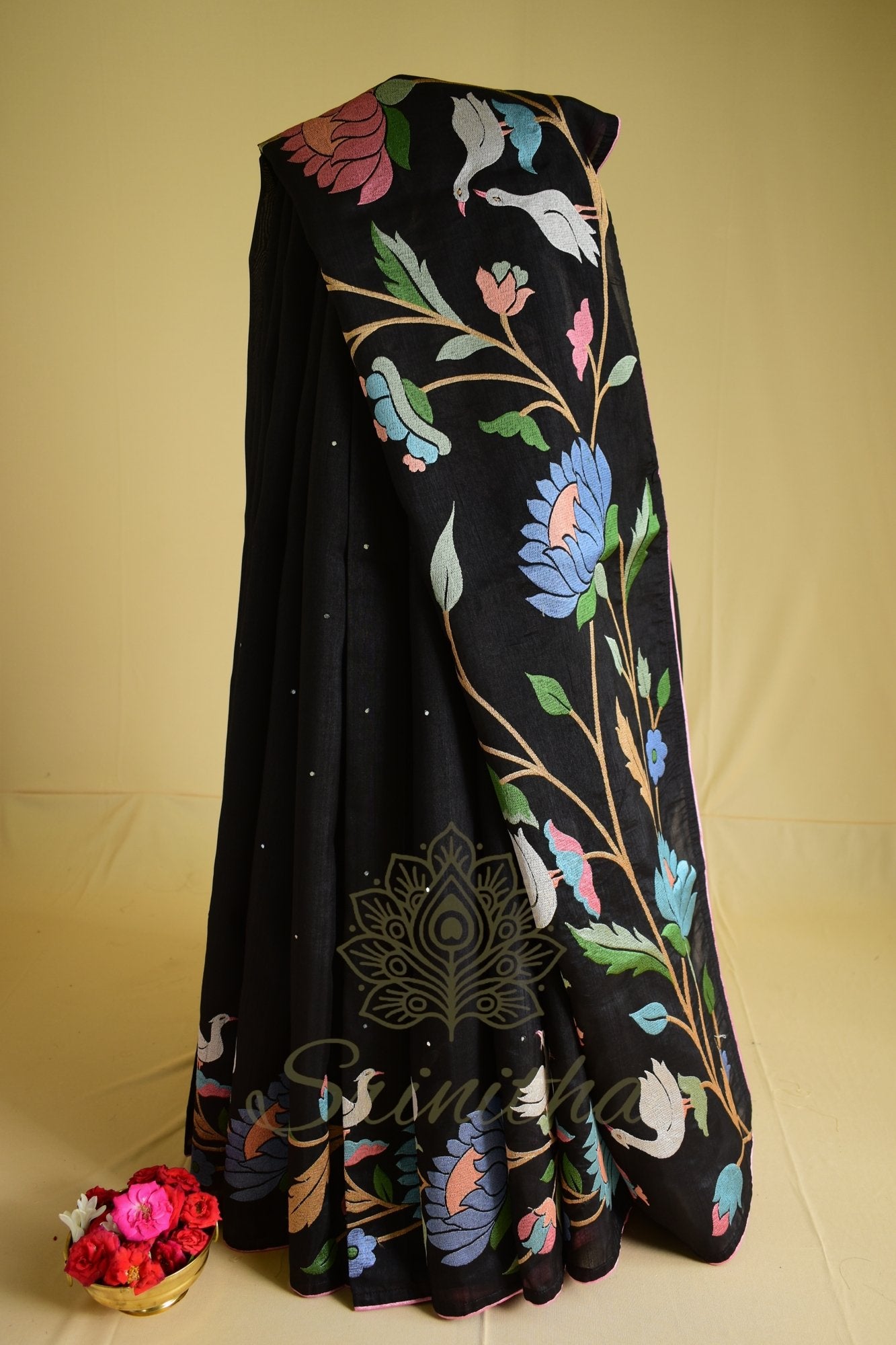 A black Tussar drape brought to life with gentle cranes, pastel florals, and a quiet star-like shimmer — a graceful ode to nature’s rhythm.