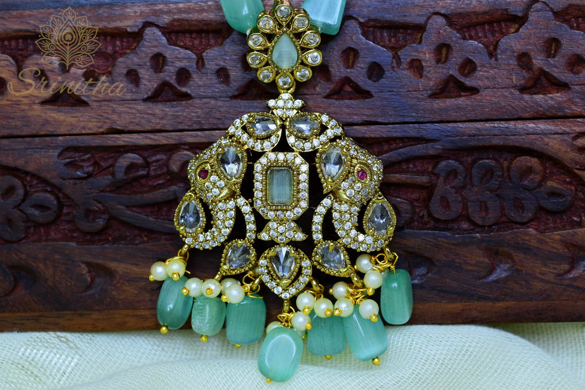 Mādhava in seafoam green is a refreshing take on traditional grace. With smooth green-toned imitation beads strung in a single strand, it flows softly into a majestic kundan pendant, richly detailed with crystals, CZ stones, and pearls. The pendant’s antique gold finish adds warmth to the cool-toned beads, creating a gentle yet commanding look.
