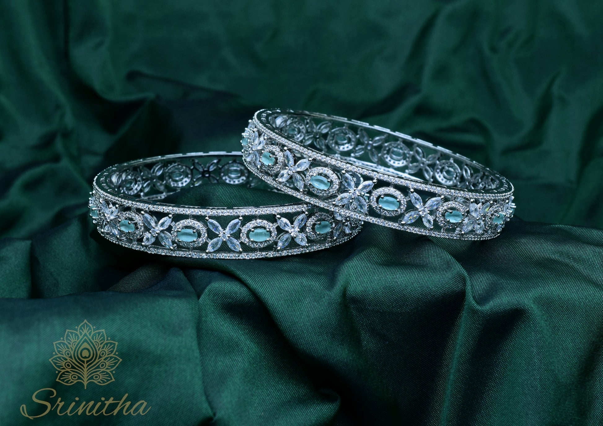 Full Description: From the Bhūṣaṇa Collection, Neelaraaga is a graceful ode to tranquillity. These bangles bring together seafoam green oval stones and sparkling CZ petals in a flowing, symmetrical design. The soft green hue carries a touch of freshness — like still waters under early light — while the detailed setting adds timeless sophistication.