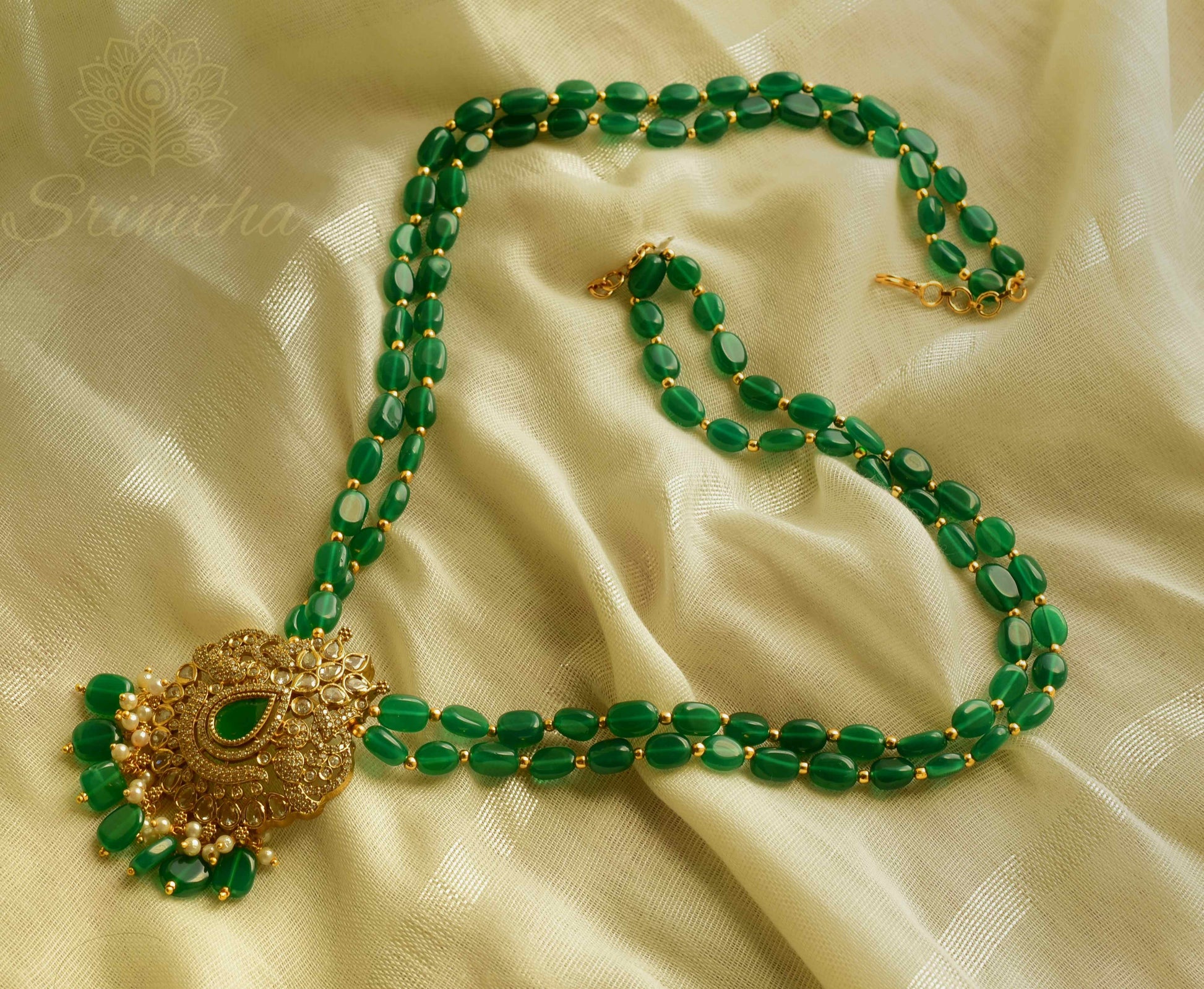 A dual-strand necklace with emerald green beads and golden accents, paired with an ornate kundan pendant and matching earrings — rich, traditional, and timeless.