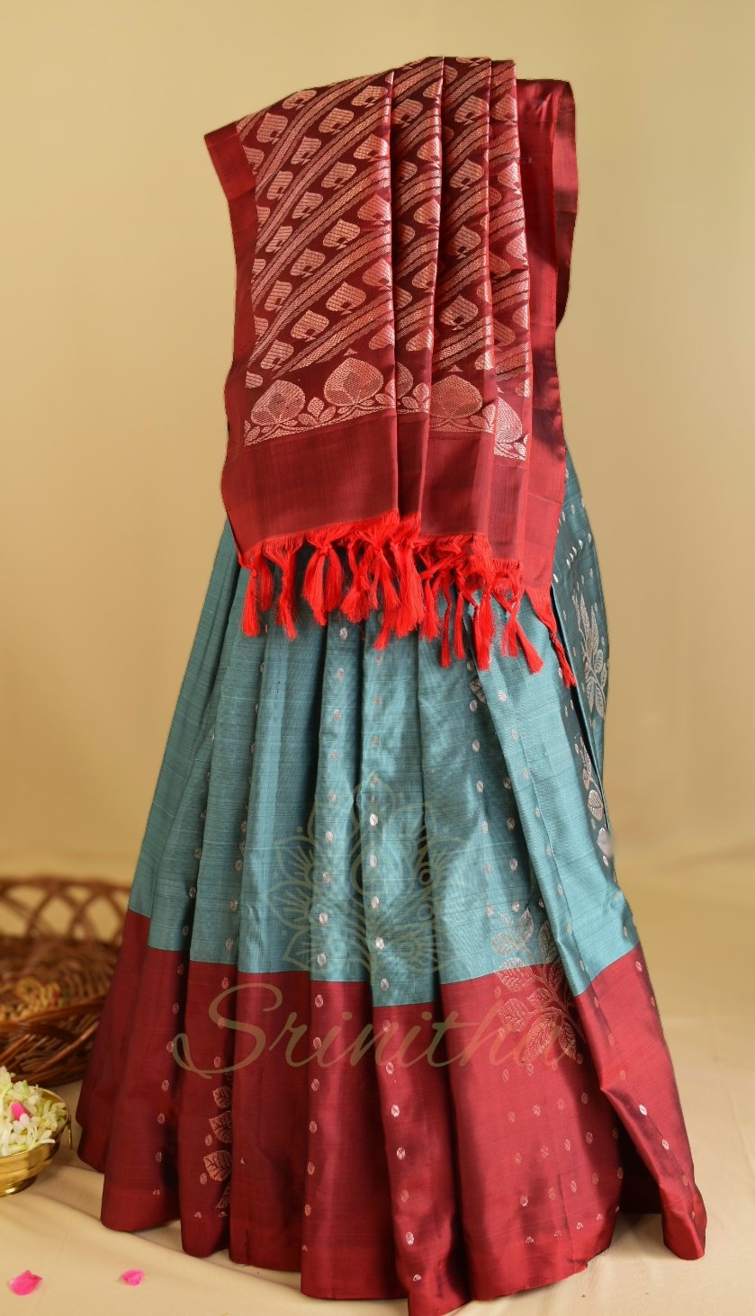 From the Vastrā by Srinitha collection, Rohinī is a drape that feels both rooted and radiant — like earth touched by twilight bloom.The body is woven in a calm dusty turquoise, highlighted by delicate zari buttas that glint like dew. The deep maroon pallu is richly adorned with floral creepers in rose gold zari — woven in graceful diagonal flow — offering a regal counterpoint to the softer base. Matching maroon borders frame the saree, holding together the contrast in quiet strength. The overall composition is balanced, poetic, and deeply traditional.