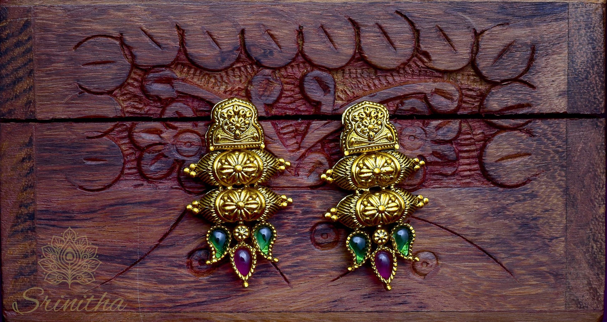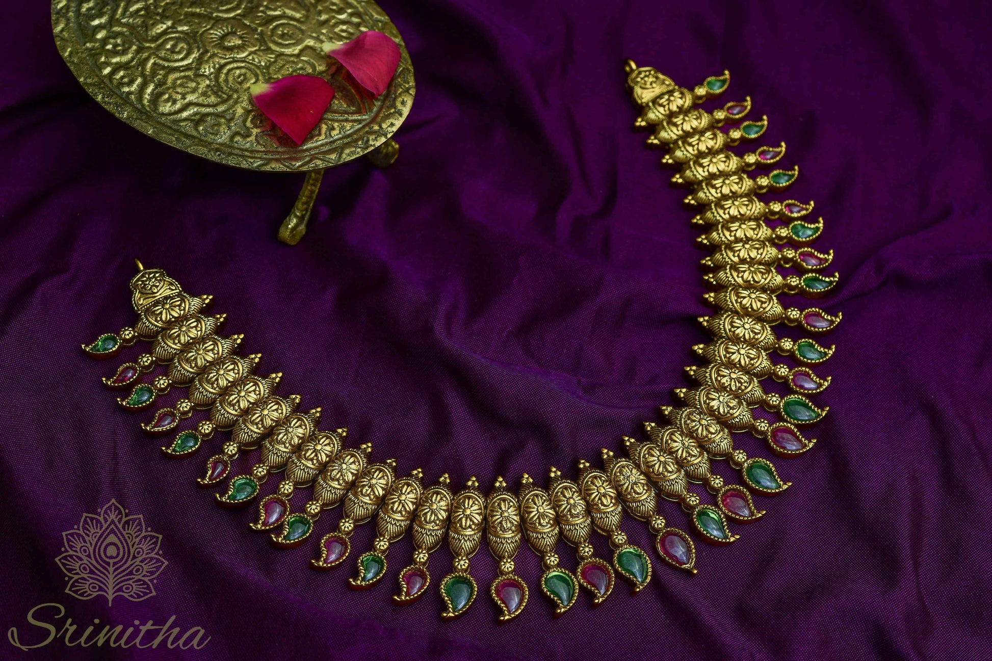 Saubhāgya reflects the elegance of South Indian bridal heritage. This matte-finish temple set features a beautifully hand-detailed necklace, designed with alternating ruby and emerald stones along traditional motifs. The matte texture gives it a softly regal appeal — subtle yet striking.