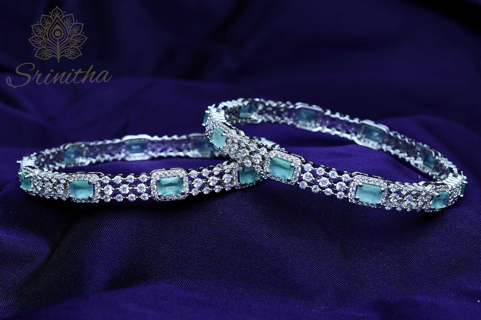 Elegant silver-finished bangles adorned with pastel green rose-cut stones, framed in delicate CZ shimmer — a graceful balance of sparkle and subtlety.