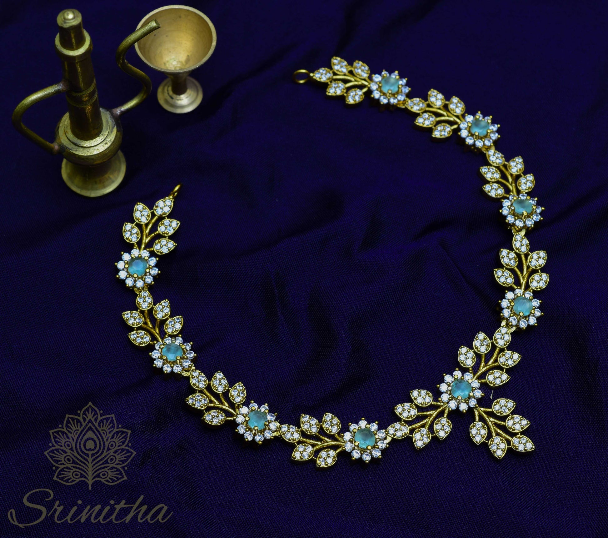 Crafted with clustered leaves and florals in shimmering American diamonds, this necklace features mint green stone centres that feel both natural and refined. The graceful arrangement flows like a garland, ending in a leaf-shaped drop that completes the composition.