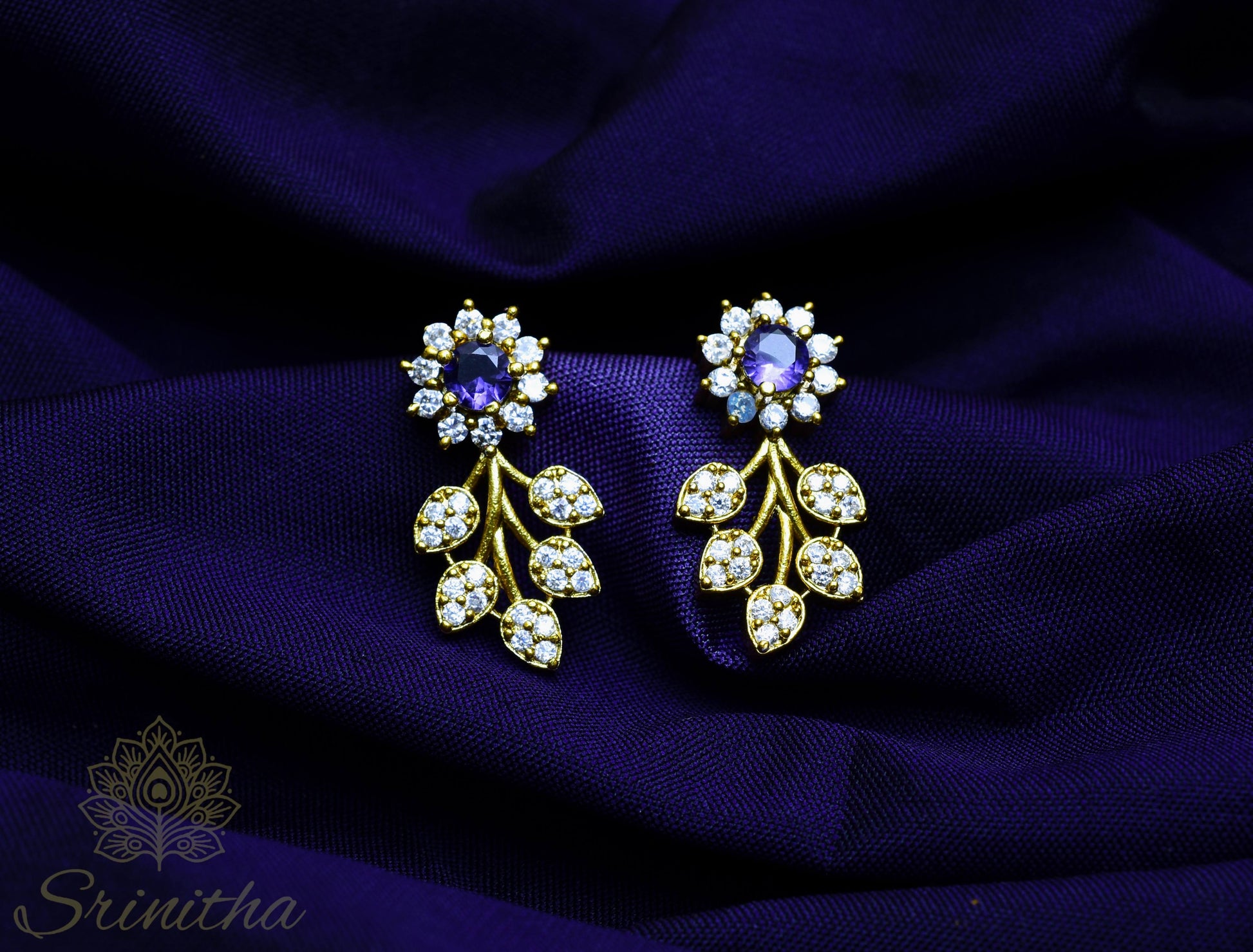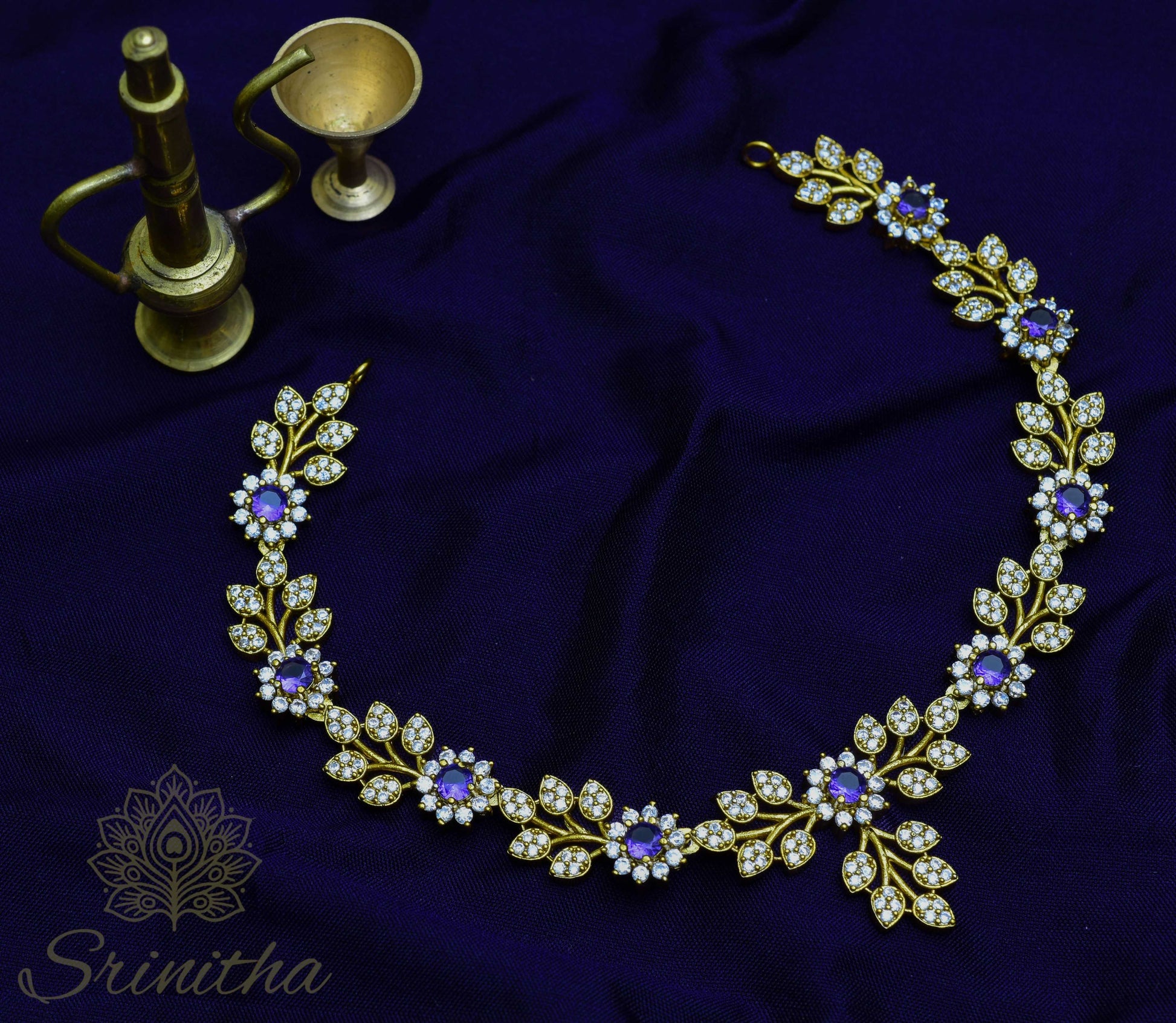 Crafted in delicate symmetry with clustered diamond-leaf motifs, this design replaces mint with violet-toned AD stones at the heart of each floral burst — adding a touch of mystique to the soft gold base. The necklace flows like foliage after rain — calm, glimmering, alive.